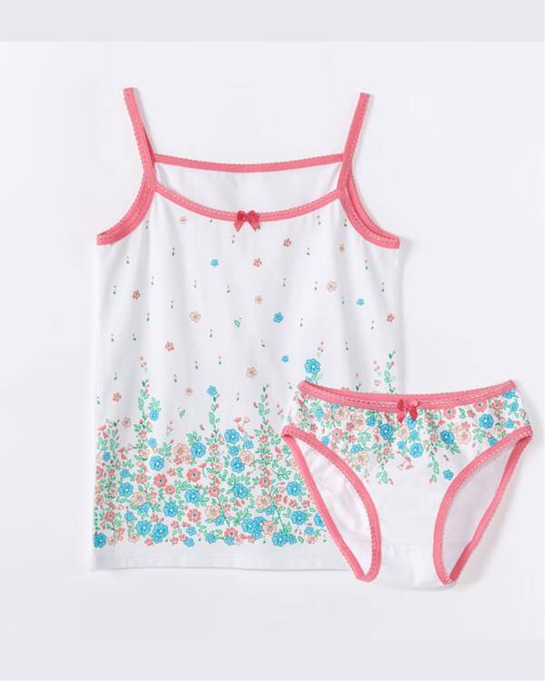Let your little one feel cozy and stylish with this Girls’ Floral Camisole & Brief Set. The adorable floral design adds a touch of elegance, while the contrast trim and bow accents bring a pop of color. The camisole features adjustable spaghetti straps for a flexible fit, and the matching briefs offer a snug yet breathable feel for all-day wear.