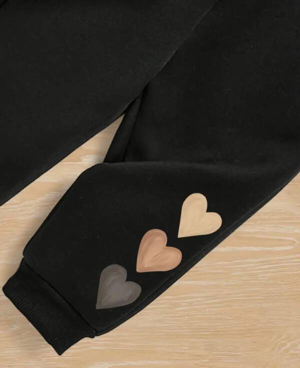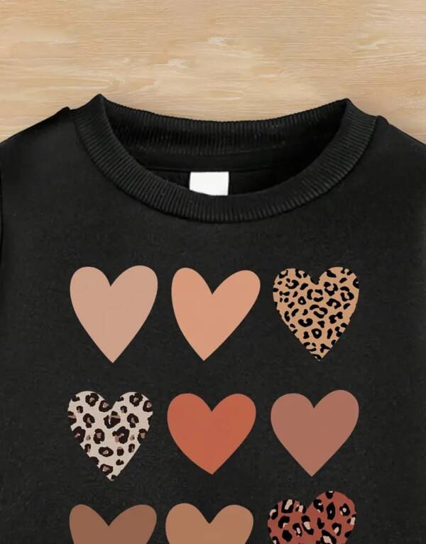 This adorable sweat set combines soft, breathable fabric with a chic heart design for a trendy yet cozy look. The crewneck sweatshirt features a beautiful mix of solid and leopard-print hearts, while the jogger pants have matching heart accents for a coordinated look. The elastic waistband and ribbed cuffs ensure a snug, comfortable fit for all-day wear.