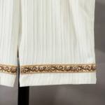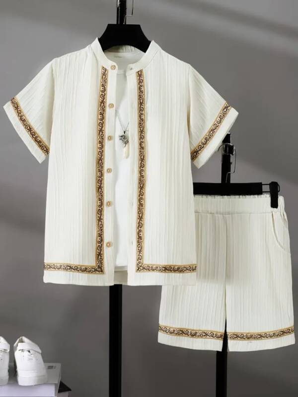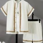 This elegant outfit combines premium textured fabric with intricate gold embroidery for a regal and refined look. The short-sleeve button-up shirt is adorned with detailed embroidery on the edges, giving it a touch of luxury. The coordinating shorts feature an elastic waistband for comfort, making it both stylish and functional.