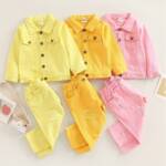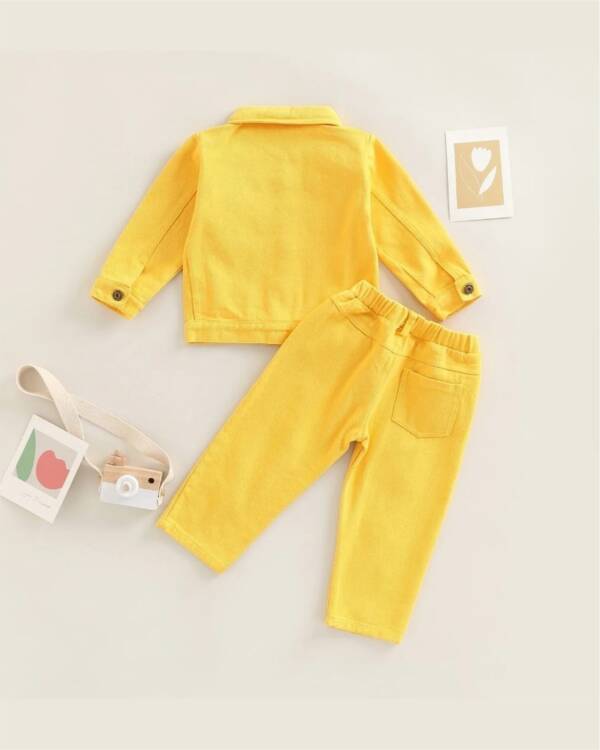 Meet the Trendy Candy Denim Set—a stylish and versatile outfit that combines the timeless elegance of denim with the comfort of cotton and polyester blend fabric. The set includes a long-sleeve lapel coat and ripped trousers, offering a loose, comfortable fit that lets your little one move freely. The solid color design is classic and easy to pair with other pieces in her wardrobe, making this set a perfect choice for various occasions.